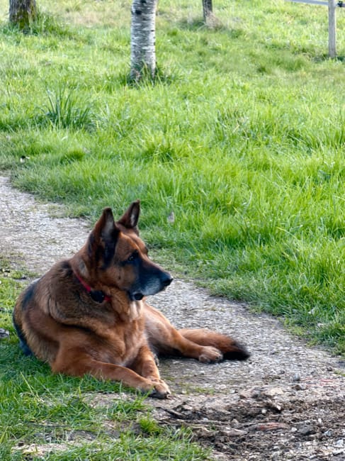 Lincoln turned 12 this year, which for a German Shepherd is honestly kind of wild. He came to us from Out of the Cage rescue in Los Angeles and has somehow, in the span of a few months, turned into a full French country dog. He walks through the village like he's been doing it his whole life. The neighbors know his name before they know ours. (We're okay with this.)